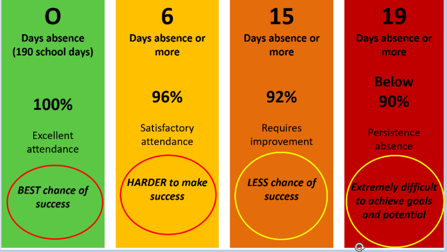 As I'm sure you are aware excellent attendance is critical to your child's success and development. This week Mr Windsor has spoken to the students about the importance of attendance and introduced them to our strapline of 'Be here to get there' This will be referred to and used frequently moving forward and become very familiar with students attending the Academy. I would like to share a visual that your child was shown this week and asked to reflect upon. Traditionally, being told you've achieved 90% at something sounds promising; however, as this emphasises, when we are talking about school attendance, 90% is actually hugely detrimental in terms of achieving potential and aspirational goals for a student. As I'm sure you'll agree, no young person wants to be at a disadvantage entering into assessments, national exams, further education or employment, and that is exactly why we want to support attendance and have the students with us for as long as possible, maximising their potential. Mr Windsor will update you on future attendance initiatives and success.