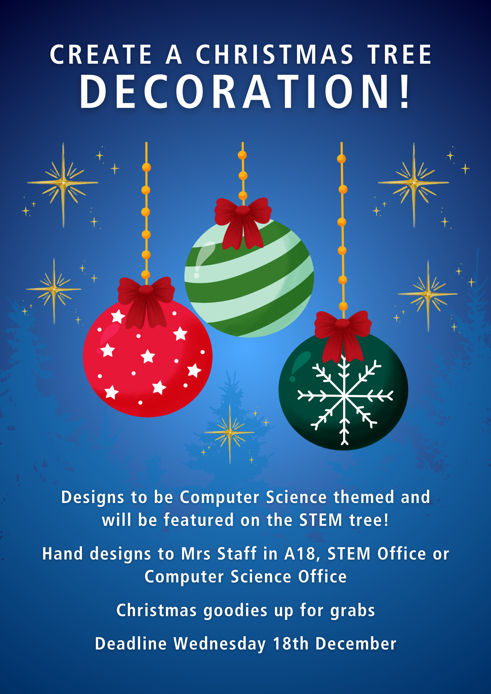 Please hand your entries into Mrs Staff in either A18, the STEM office or the Computer Science office.