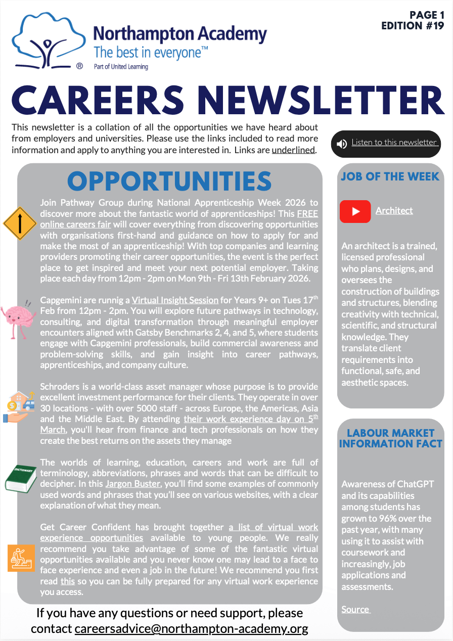 Year 12 students complete a work placement, further enhancing their skills and experience for higher education or the workplace. Academic and vocational options are explored to enable students to make informed decisions regarding their next steps including apprenticeships, vocational courses, employment with training and A Levels.