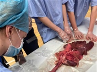 Since students administered general anaesthetic, which stops the nervous system working, the patient can no longer breathe independently. So students were tasked with intubating a real thorax with an intubation tube, establishing an airway for the patient to breathe with. They then inflated the lungs with air. Moving down to the heart now… students dissected a heart to examine the structures of the ventricles, atria and vessels.