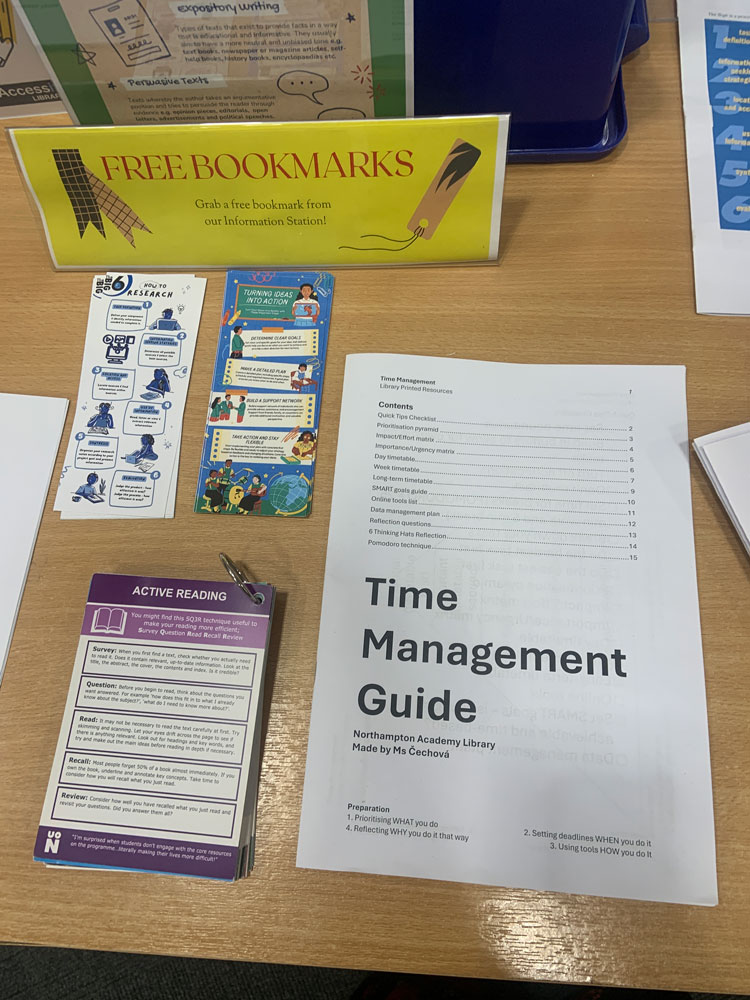 Our school library has a newly set up Information Station, an area near the non-fiction bookshelves where students can find leaflets, booklets, and bookmarks with useful guidance on how to research and study independently, including a guide to time management.
